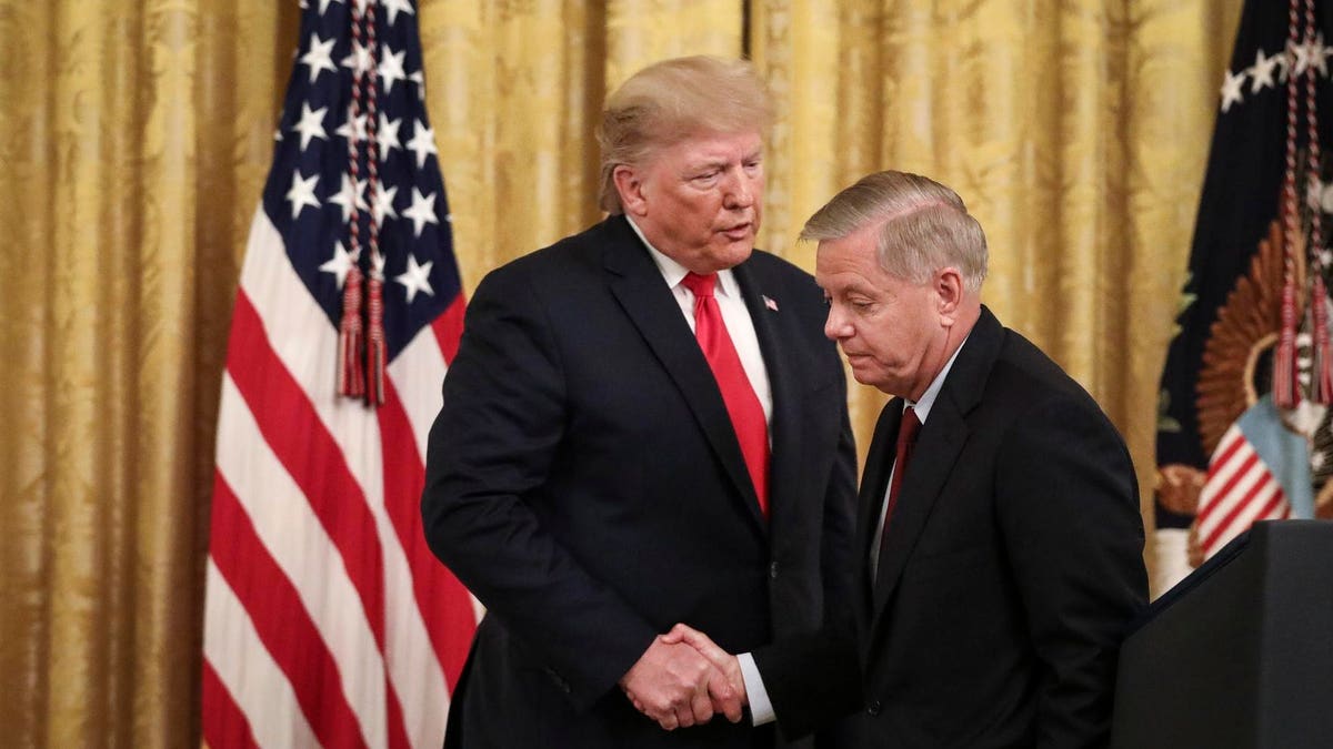 President Donald Trump shakes fingers with Sen. Lindsey Graham (R-S.C.) proper through an event about judicial … [+] confirmations within the East Room of the White Dwelling on November 6, 2019, in Washington, D.C.