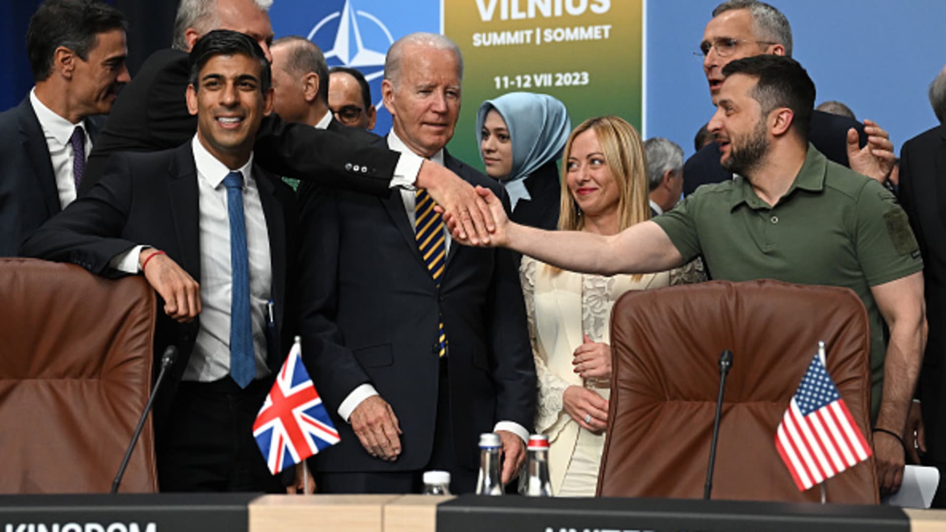 Ukraine’s President Volodymyr Zelensky (R) shakes palms with Lithuania’s President Gitanas Nauseda (2nd L) subsequent to (L-R) Spain’s Prime Minister Pedro Sanchez, Turkey’s President Recep Tayyip Erdogan, US President Joe Biden Italy’s Prime Minister Giorgia Meloni and NATO Secretary Related outdated Jens Stoltenberg at a gathering of the NATO-Ukraine Council at some stage of the NATO Summit on July 12, 2023 in Vilnius, Lithuania.